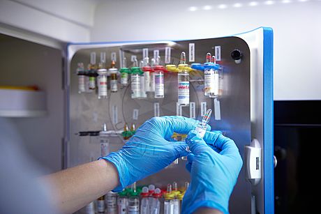 Eine Mitarbeiterin des Rettungsdienstes der Johanniter nimmt eine Ampulle aus dem Medikamentenschrank.
