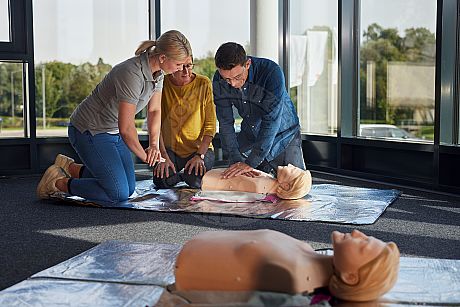 Eine Erste-Hilfe-Ausbilderin der Johanniter leitet Kurs-Teilnehmende bei der Herz-Lungen-Wiederbelebung an.